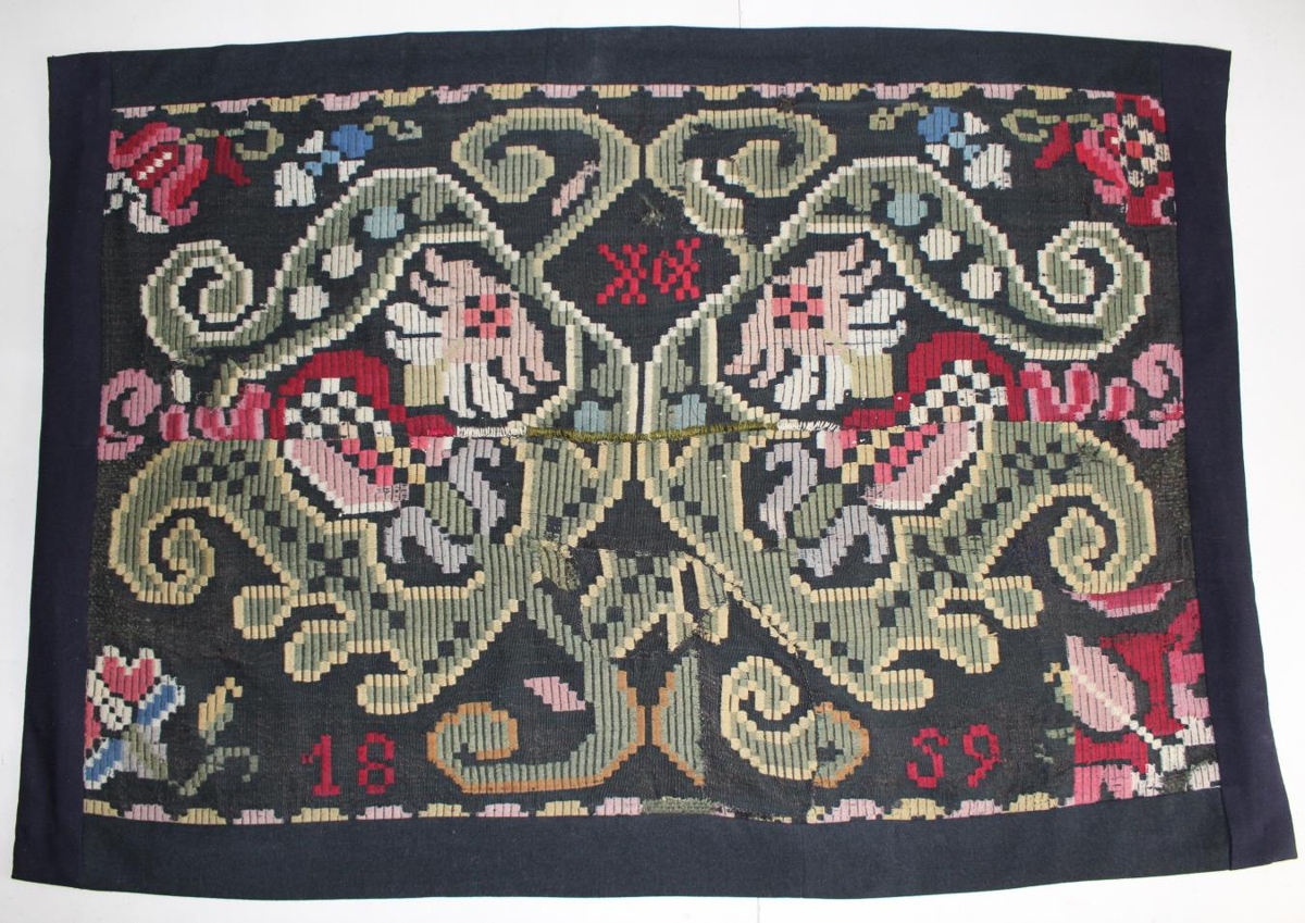 Hlutar af söðuláklæði Maddömu Þuríðar Kjartansdóttur frá Skógum undir Eyjafjöllum, með fangamarki hennar , ÞK., og ártali 1859. Miðhluti áklæðisins hefur verið orðið mjög slitinn og brugðið á það ráð að eyða honum og setja endana saman. Þuríður hefur ofið áklæðið í föðurgarði en ári síðar (1860) giftist hún séra Jóni Jónssyni á Mosfelli í Grímsnesi. Glitvefnaðurinn er í hefðbundnum stíl og vel gerður, band greinilega til mestra muna jurtalitað. Jóhanna dóttir Þuríðar eignaðist áklæðið. Frá henni gekk það til dóttur hennar, Þurðiðar Stefánsdóttur, móður gefanda. Fyrir Skógasafn er þetta mikilsverð gjöf.