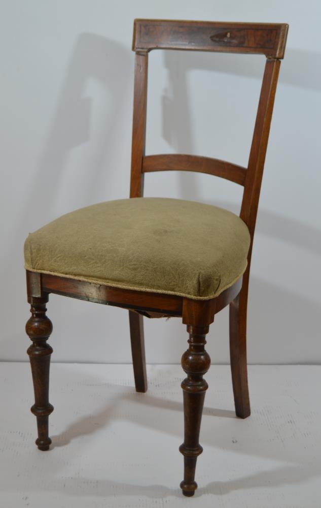 Stofustóll, borðstofustóll. Seta bólstruð, líklega upprunalegt ullaráklæði. Framfætur renndir. Bak og lag stóls í anda síð-keisarastílsins danska.