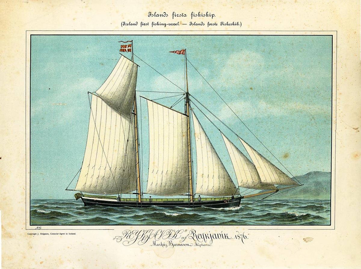 Texti á myndi: Íslands firsta fiskiskip (Iceland fishing-vessel. - Islands förste Fiskeskib.). Reykjavík 1876 - Markús Bjarnason skipherra.