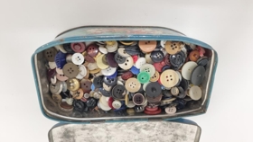 Blikkkassi með tölum, grænn með rósamyndum.