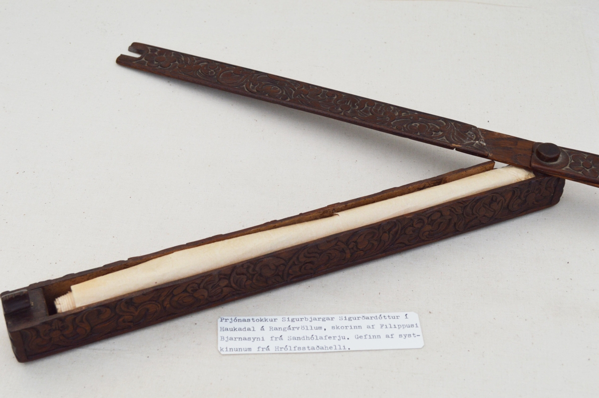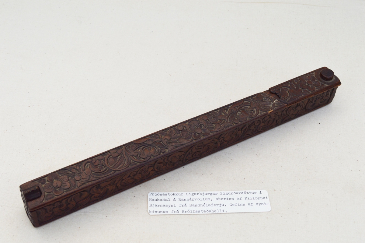 Prjónastokkur Sigurbjargar Sigurðardóttur, konu Hannesar Jónssonar í Haukadal á Rangárvöllum, skorinn af Filippusi Bjarnasyni á Efri-Hömrum í Holtum. Er með ártali,
