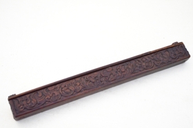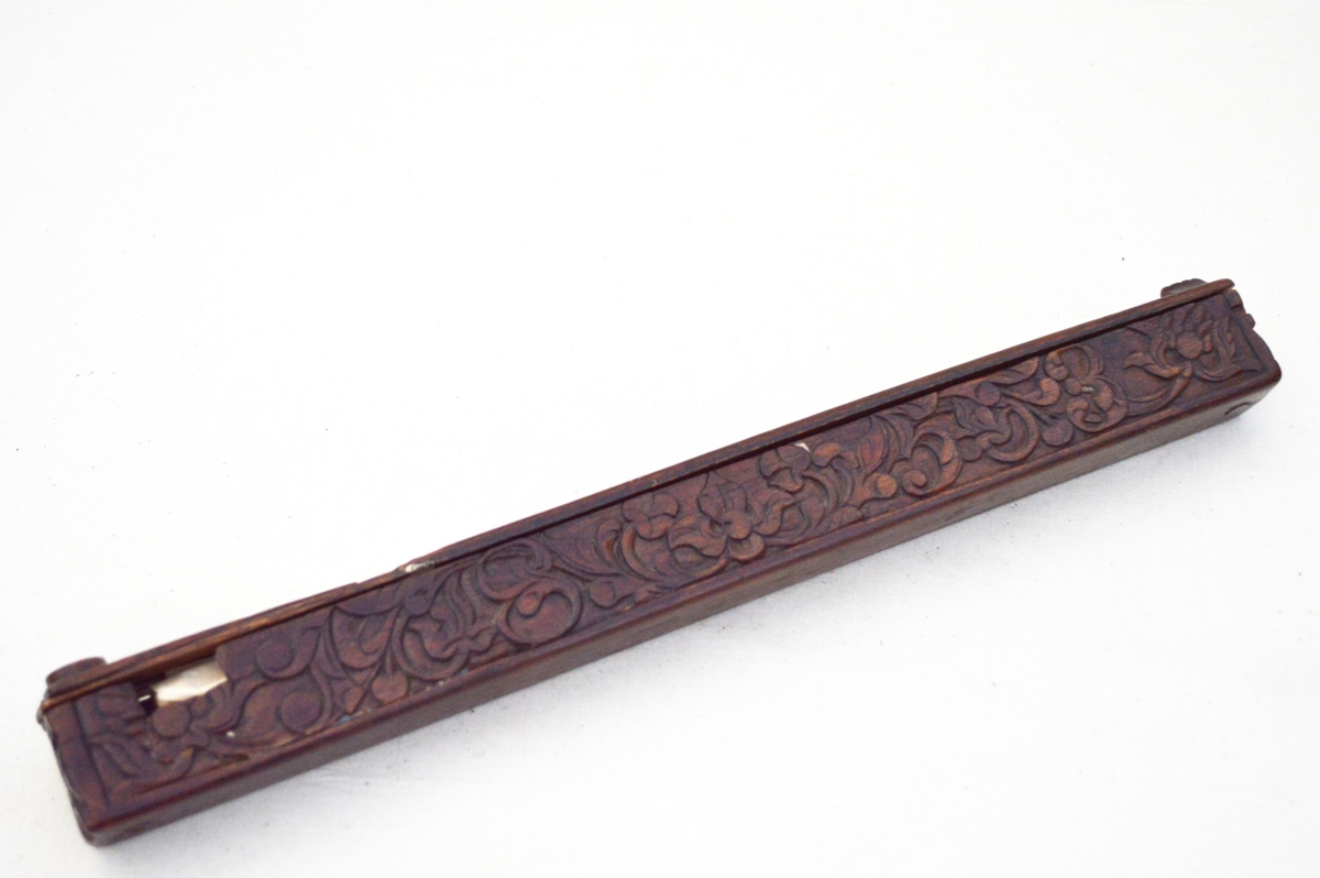 1853, og fangamarki. S S D. Skurður er forkunnar goður. Smíðaefni er mahóní. Lengd 35 cm.,br. 2,7 cm., hæð 3,5 cm.
