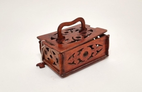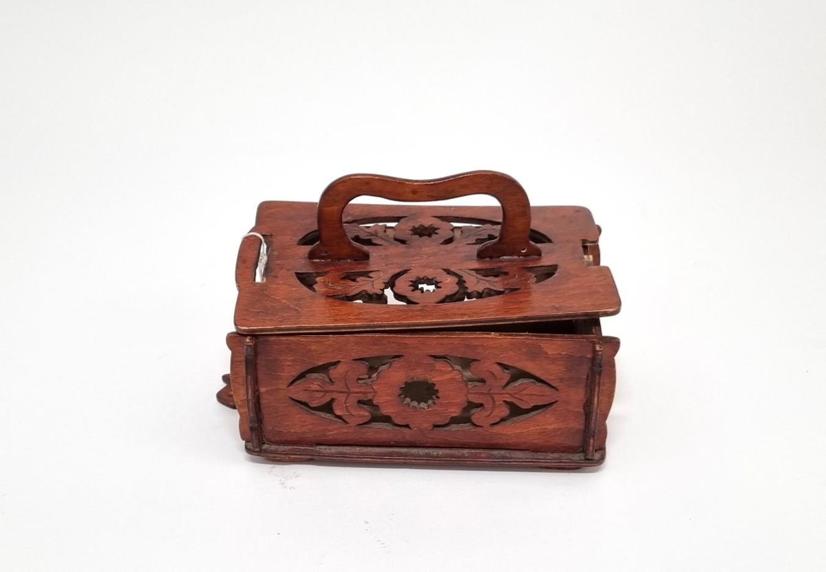 Skrín, smíðað úr krossviðarplötu. Bæsað og lakkað. Þarfnast lítilsháttar viðgerðar. Að öllum líkindum smíðað af Guðjóni á Stóra-Hofi.