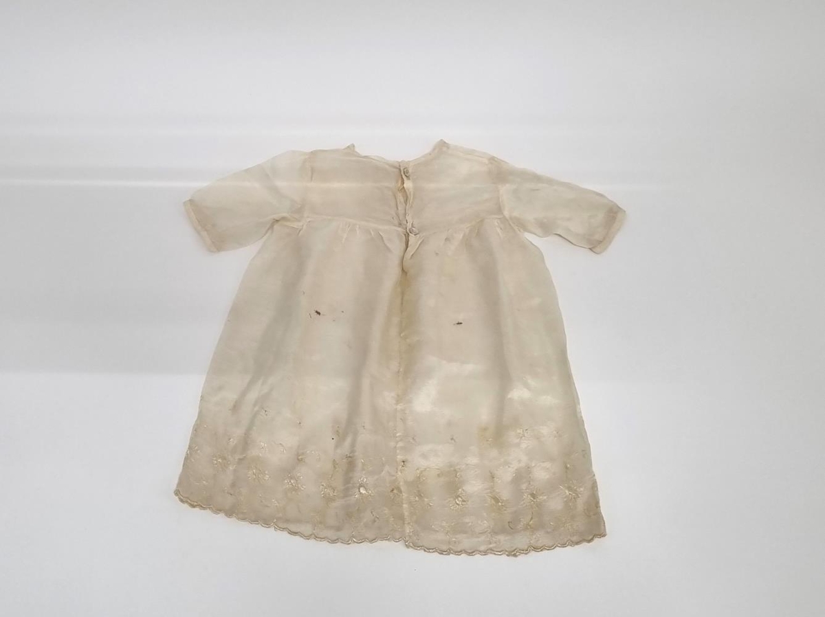 Lítill kjóll, á ungabarn, ekki vitað um fyrri notkun. Sennilega skírnarkjóll.