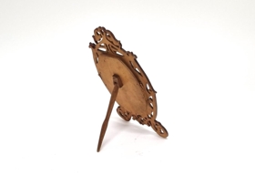 Ljósmyndarammi fyrir sporöskulaga mynd, úr krossvið, brúnbæstur og lakkaður.