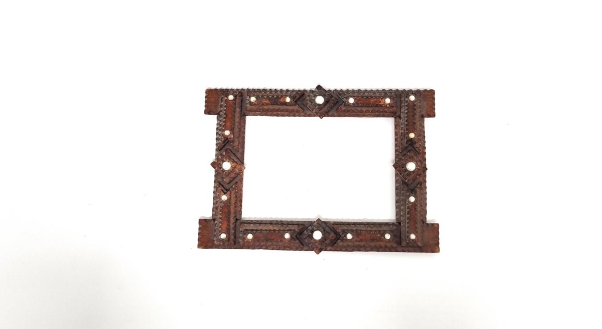 Ljósmyndarammi úr við og með hvítum hálfkúlum úr plasti eða postulíni áfestum.