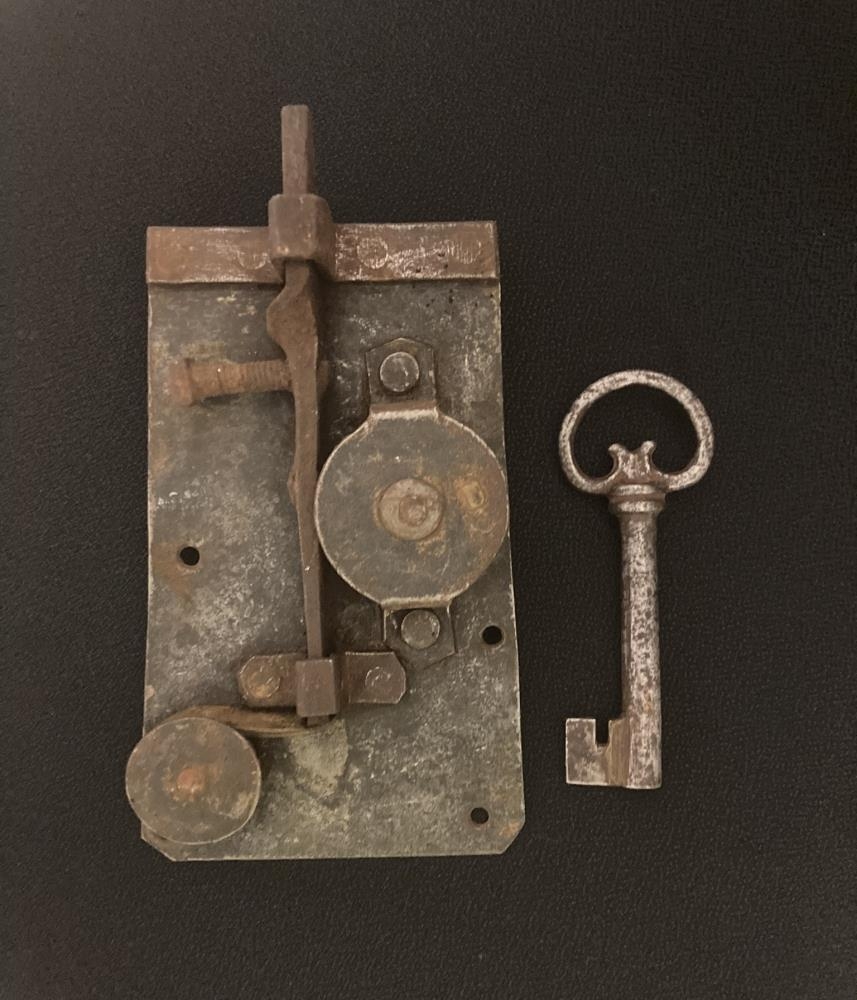 Hurðarskrá úr járni, íslensk. Var fyrir hlöðu Jóns Auðunssonar bónda í Hvammi um og eftir aldamótin 1900. Skrárfóður endurnýjað af Sigurjóni Magnússyni bónda í Hvammi um 1940. Stærð 16,5 x 10 cm. Mjókkar til ytri enda. Góður járnlykill. Samskeyti eirbrösuð. Halda nýrnalaga. Lengd 11 cm. Skráarlauf úr járni. Lykillinn vísar að smíði til um 1860.