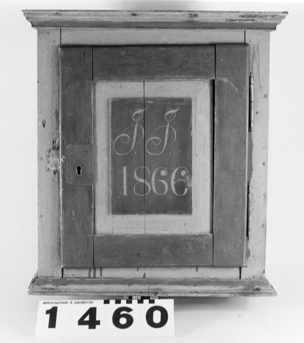 Hurð er yfirfölsuð með spjaldi. Skápurinn er málaður ljósrauður með bláum röndum á listum, hurðarrammi og miðflötur hurðarspjaldsins blár, á flötinn málaðir stafirnir J.J. og ártalið 1866.