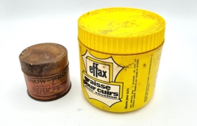 Tvær dósir af feiti fylgja skíðunum. Sennilega er minni dósin feiti til að bera á leður. Sú stærri til að bera á skíðin.