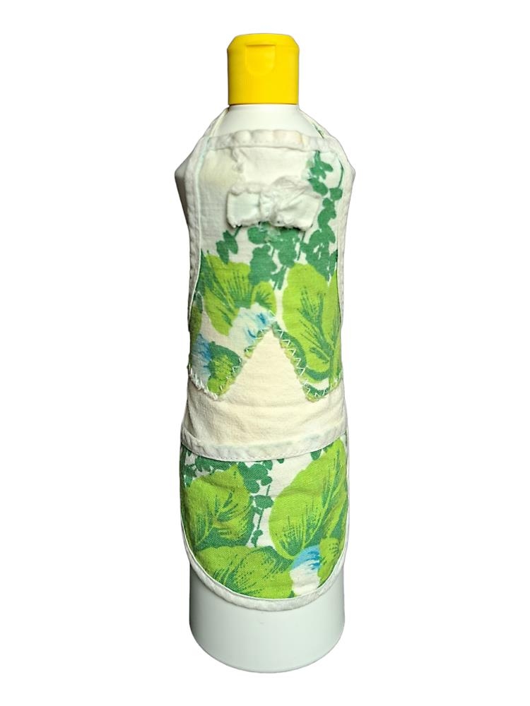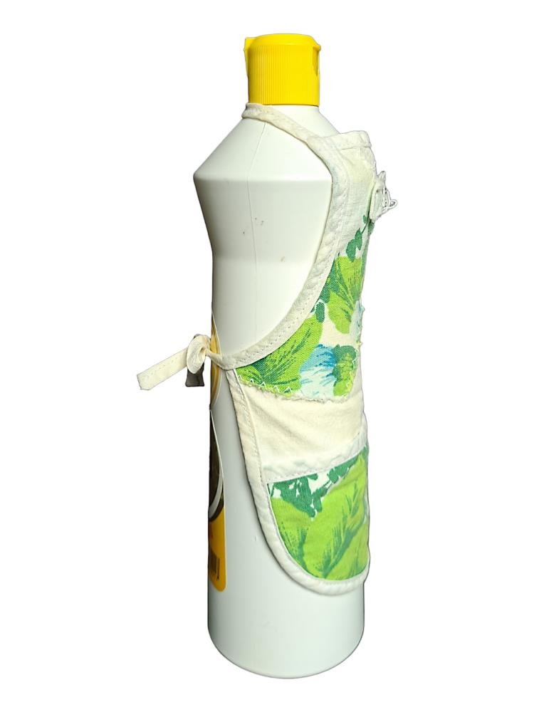 Búið er að sauma svuntu á flöskuna sem Anna hefur gert.