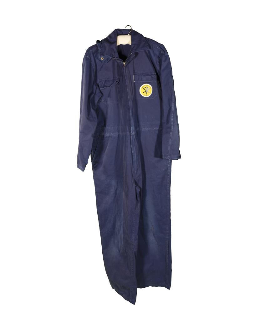 Blár vinnugalli með hettu og lógói Sementsverksmiðju ríkisins