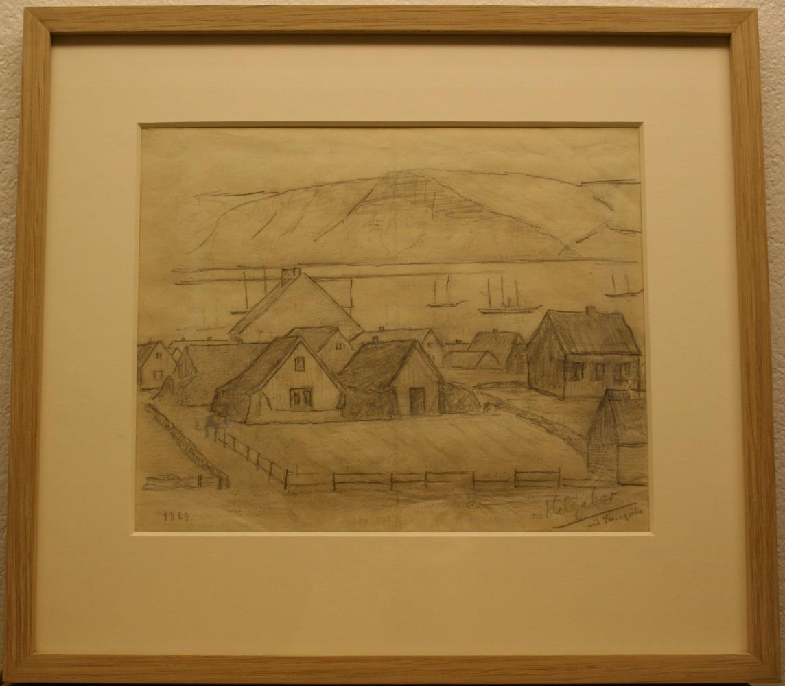 Mynd eftir Jón Helgason: Helgabær í Grjótaþorpi 1869. Blýantsteikning, undir gleri í viðarramma.