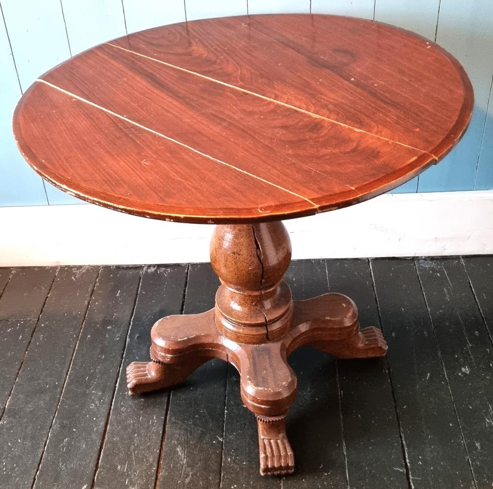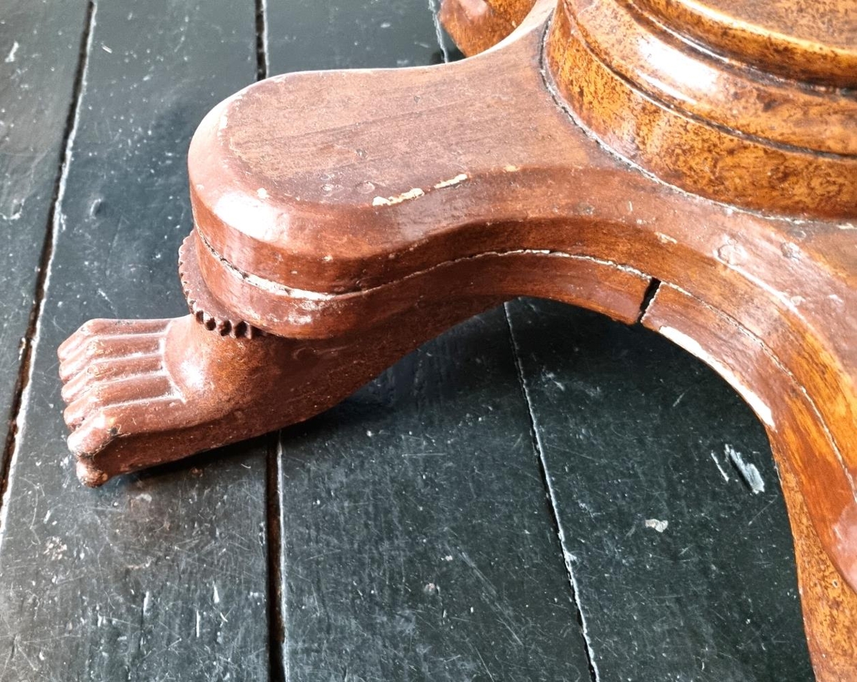 Hringlaga stofuborð úr við, brúnbæsað og lakkað, fætur útskornir.
