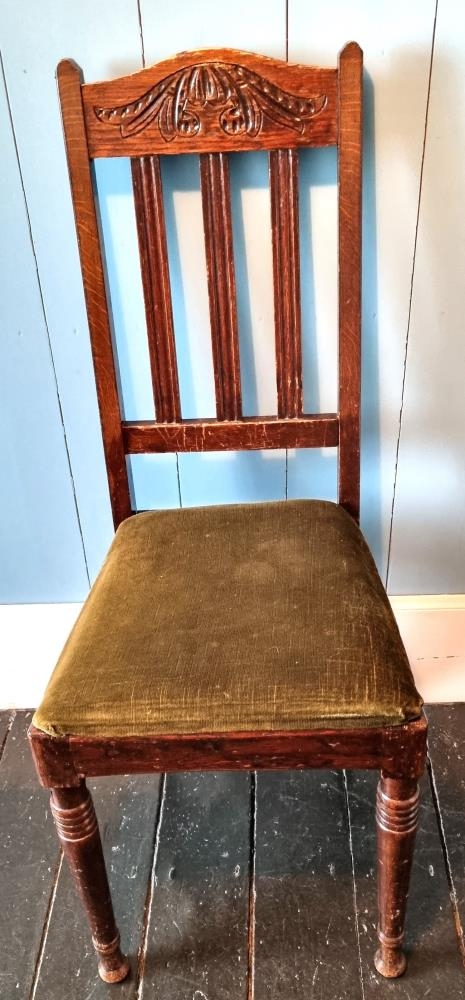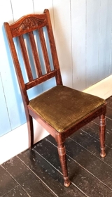 Fjórir stólar sem fylgja borði nr. 2023-5-3. Með plussi á setu. Útskurður á stólbaki.