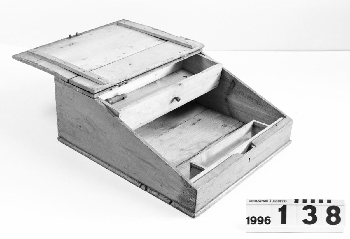 er skrá fyrir lykil. Að innan er púltið ómálað og með einni skúffu og litlum