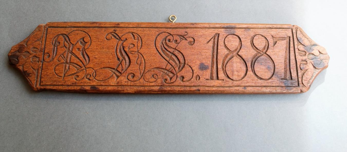 Útskorin mahonífjöl, 35 cm á lengd, 7,8 cm á bredd. Á hana er letrað Þ J S 1887. Jurtaskreyti til enda. Þetta virðist vera verk Filippusar Bjarnasonar frá Sandhólaferju eða einhvers af hans ætt. Leopold fann fjölina í rusli í Reykjavík 1995. Gefið af Leopold Jóhannessyni, Jökulgrunni 2, Reykjavík.