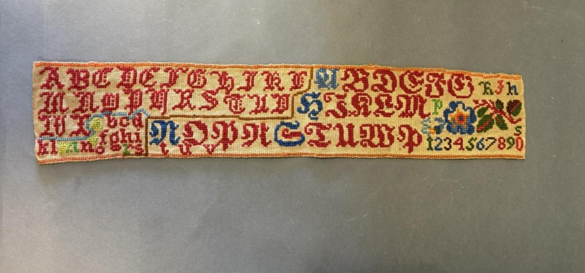 Stafaklútur móður gefanda, Salvarar Tómasdóttur frá Arnarhóli í Landeyjum (f.1874), saumaður af henni um 1888. Lengd 53 cm., br.10 cm. Tvö gotnesk stafróf, tölustafir, rósir m.a. Í klútinn virðist saumað fangamark föðu Salvarar, Tómasar Jónssonar á Arnarhóli.