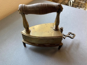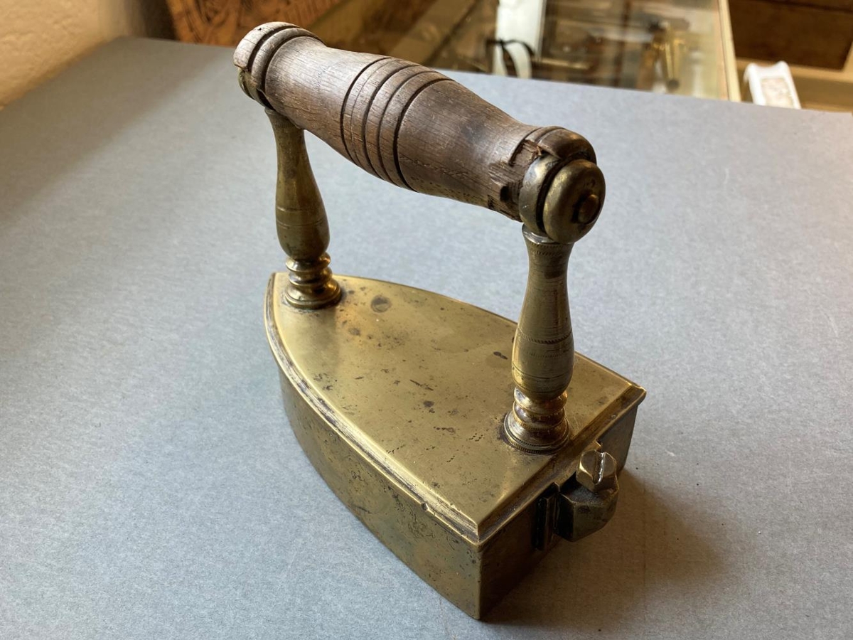Pressujárn úr kopar,með handfangi úr tré og lausri járntungu, mjög eyddri. Skrúfnagli heldur lokinu og handfanginu í föstum skorðum. Innan í botninn er letrað merki smiðsins: J.F.SÍRLÆK 1889. Smíði Jóns Friðleifssonar frá Efra-Sýrlæk. Grindin undir járninu er útlent.