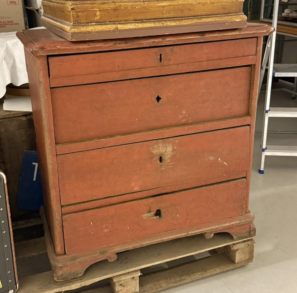 Kommóða, rauðmáluð, smíðuð af Halldóri Guðmundssyni í Strandarhjáleigu í Landeyjum laust fyrir 1890.