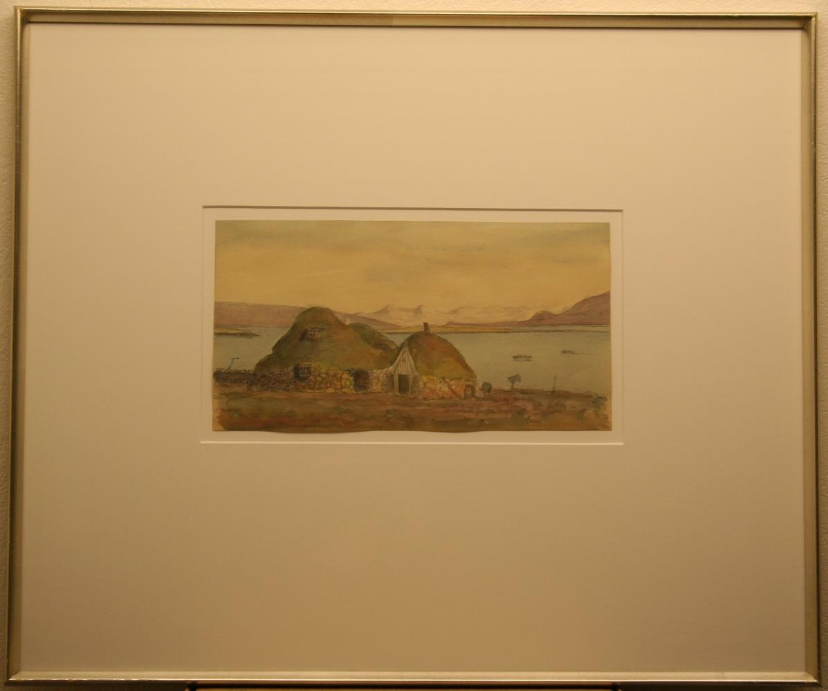 Málverk eftir Jón Helgason: 4. Helluland við Vesturgötu um 1870. Vatnslitir á pappír, undir gleri í silfurlituðum viðarramma.