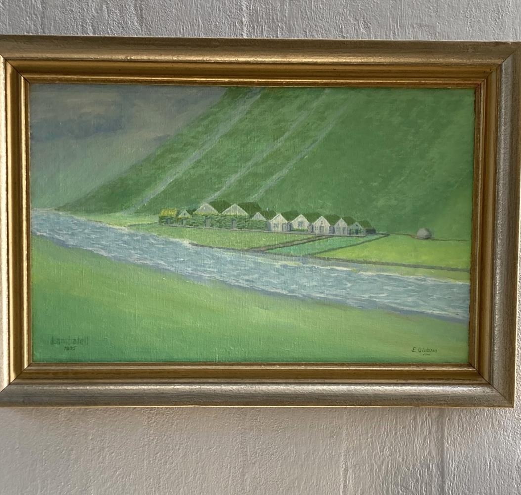 Olíumálverk Engilberts Gíslasonar af Lambafelli 1895. Lambafellsá, Svaðbælisá öðru nafni, rennur fram hjá bænum og brýtur niður kálgarðinn. Bærinn var fluttur austar 1912. Guðjón Jónsson frá Seljavöllum og Tómas Sveinsson frá Selkoti gáfu Steinunni Jónsdóttur frá Lambafelli málverkið er hún varð 75 ára. Það er málað eftir lýsingu og sennilega ljósmynd Friðriks Gíslasonar frá 1895.