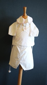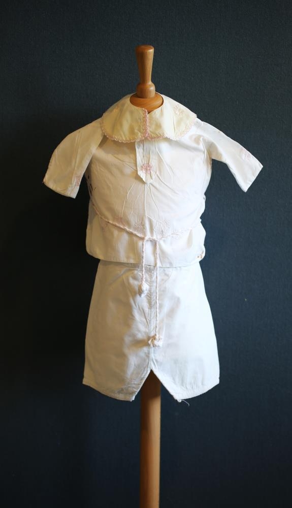 Skírnarföt tvíburabræðranna Baldurs og Braga Jónssona. Saumuð af Hildi Stefánsdóttur (11.8.1897-30.12.1965), móður þeirra. Settið er úr bómull og samanstendur af hvítri stuttermaskyrtu, stuttbuxum og lausum kraga. Útsaum með bleikum þræði (einhversskonar blóma- og laufamunstur) má finna á skyrtunni og kraganum, sem og á köntum kragans. Á skyrtunni er áfast snúið band úr hvítum og bleikum þræði og dúskum á hvorum enda.
