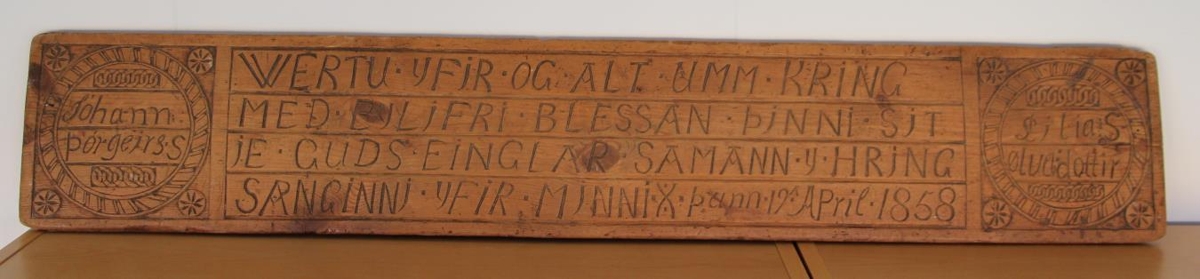 Sitt hvoru megin við bænina eru útskornir hringir inni í ramma, í hverju horni rammans er útskorinn hringur með blómi inn í. Í hringnum vinstra meginn er útskorið nafnið „Jóhann“ í efri línu og í neðri línu er nafnið „Þórgeirs-S“. Fyrir ofan og neðan við nafnið er útskorinn bekkur með hringjum. Hinn hringurinn er eins, nema þar er annað nafn; „Lilja:S“ í efri línu og í neðri línu er „Ölva:dottir“.