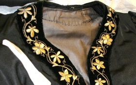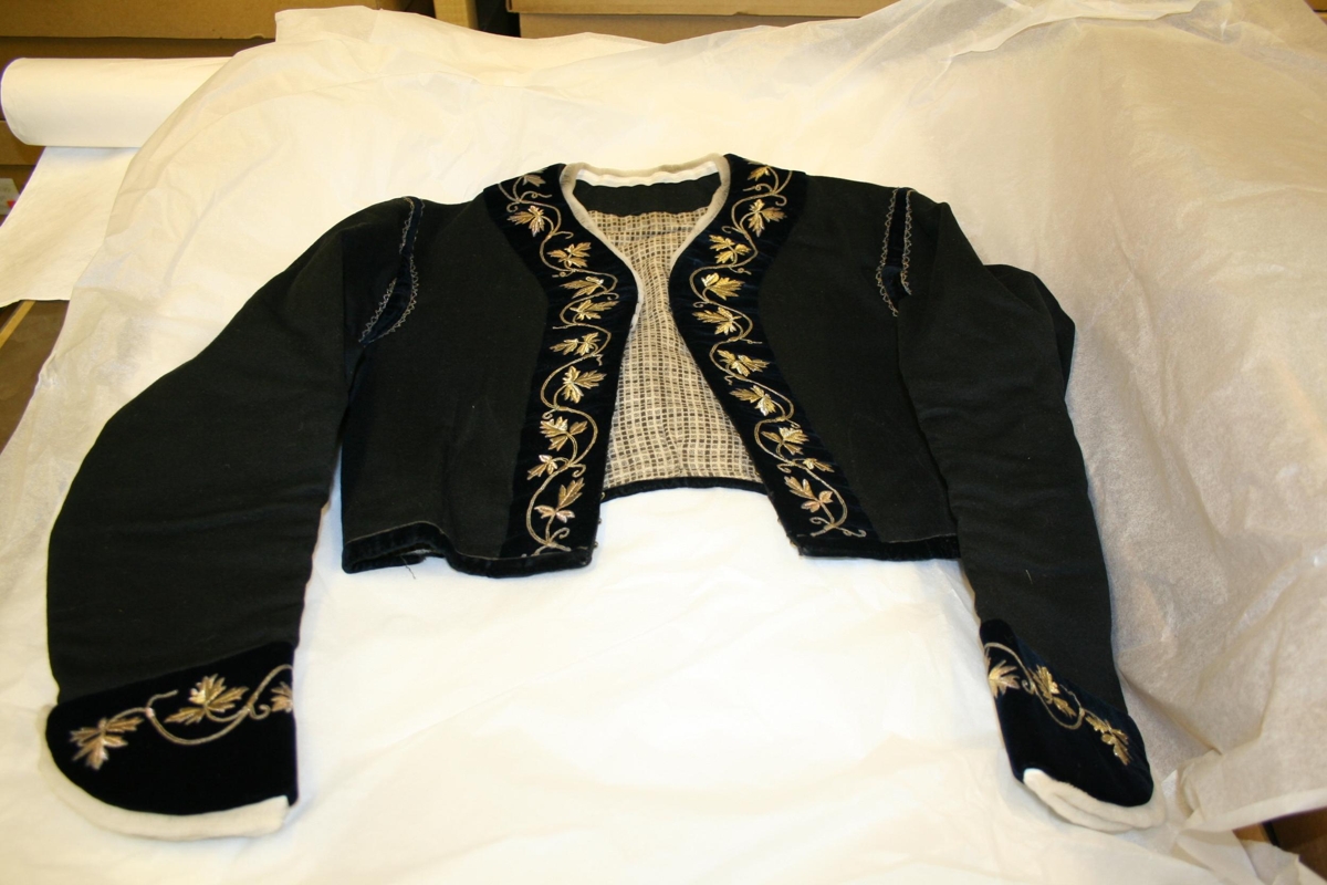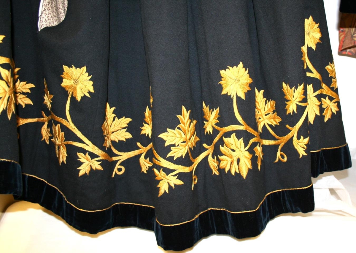 Þjóðbúningur. Skautbúningur, pils/samfella og treyja. Pils með gyltum útsaumuðum bekk, lauf-mynstur.