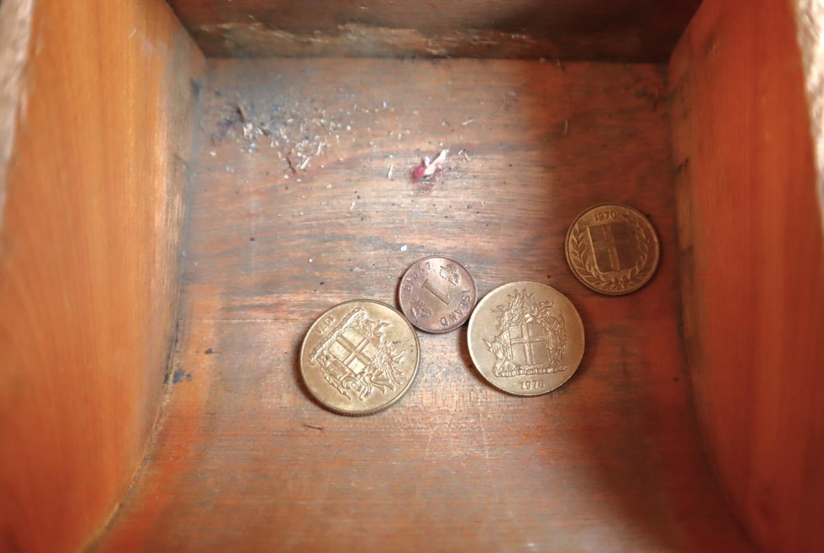 Peningakassi, stór og þungur, oft nefnt sjóðsvél. Merki / límmiði frá versluninni Geysi, Aðalstræti 2, Reykjavík er á kassanum en óvist er hvort hann hafi verið notaður þar. Gerð "National". Í kassanum eru nokkrar myntir; krónur og aurar.