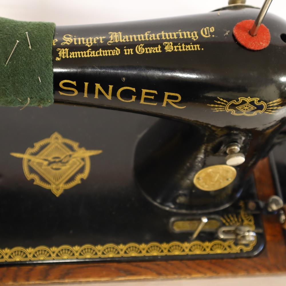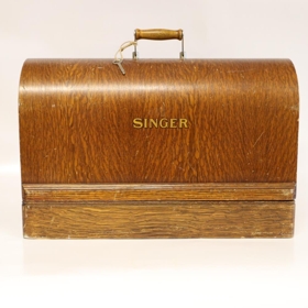 Singer saumavél í kassa með fylgihlutum, líklega frá árinu 1947. Saumavélina átti Helga Steinsdóttir frá Sólbakka í Garði.