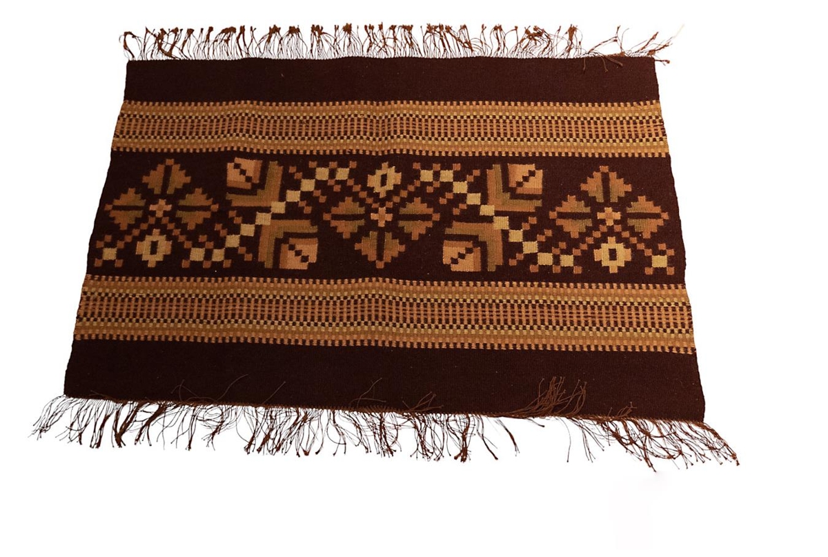Uppistaða vefsins er hör og með jurtalituð ullarbandi. Aðal liturinn er dökkbrúnn með millibrúnum, ljósbrúnum og grænum litum.