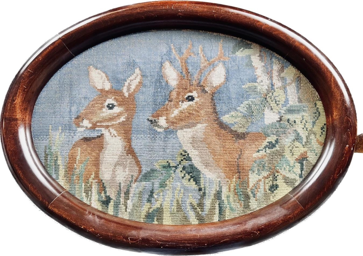 Útsaumuð mynd af dádýrum í sporöskjulaga viðarramma. Keypt á uppboði fyrir 1950.