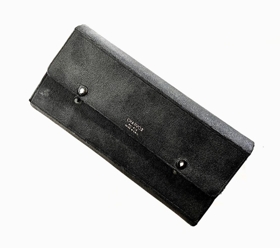 Sirklasett. Svart hulstur úr plasti fóðrað með bláu flaueli og hólf fyrir hvert áhald. Smellt saman