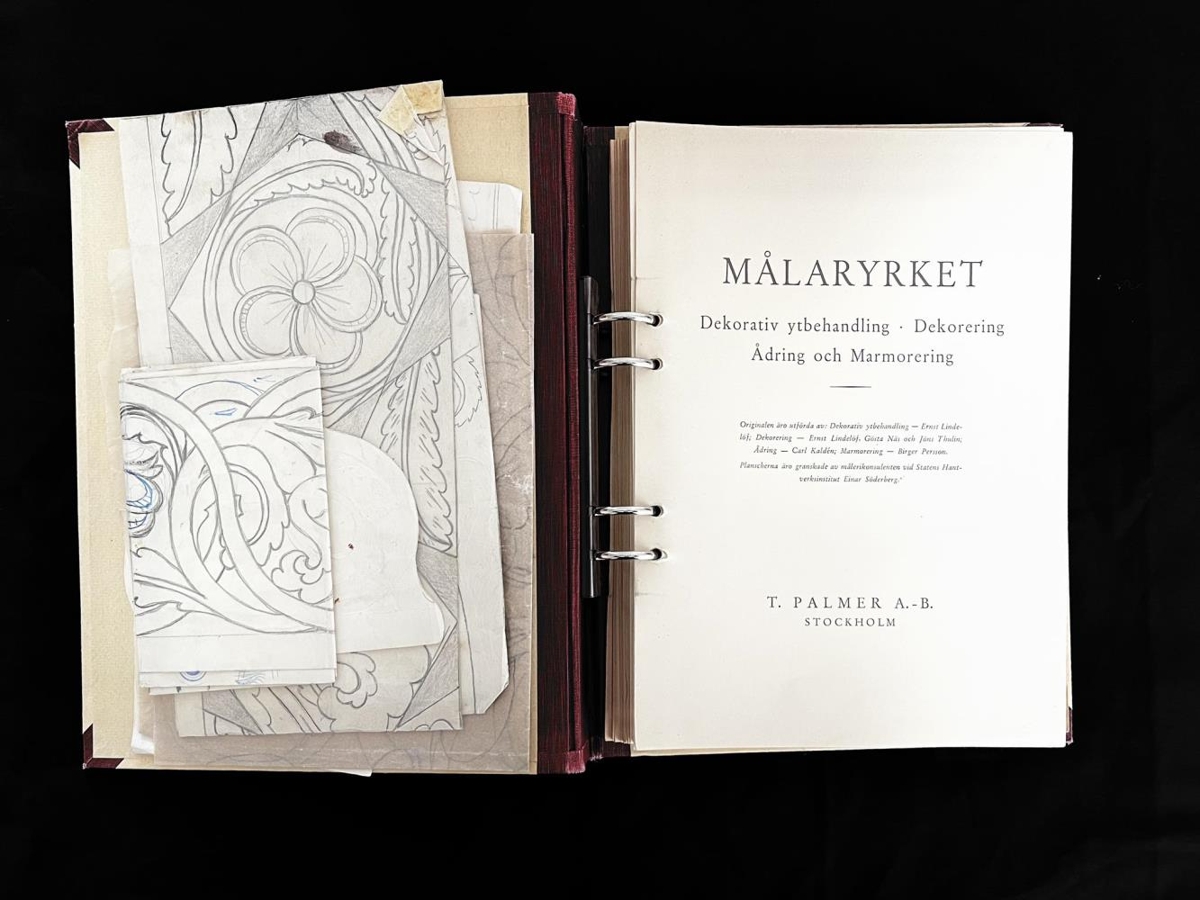 Mappa með myndum af munstrum og áferðum málningar og skrautstíla. Nokkur handteiknuð munstur í möppunni.