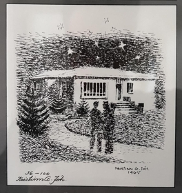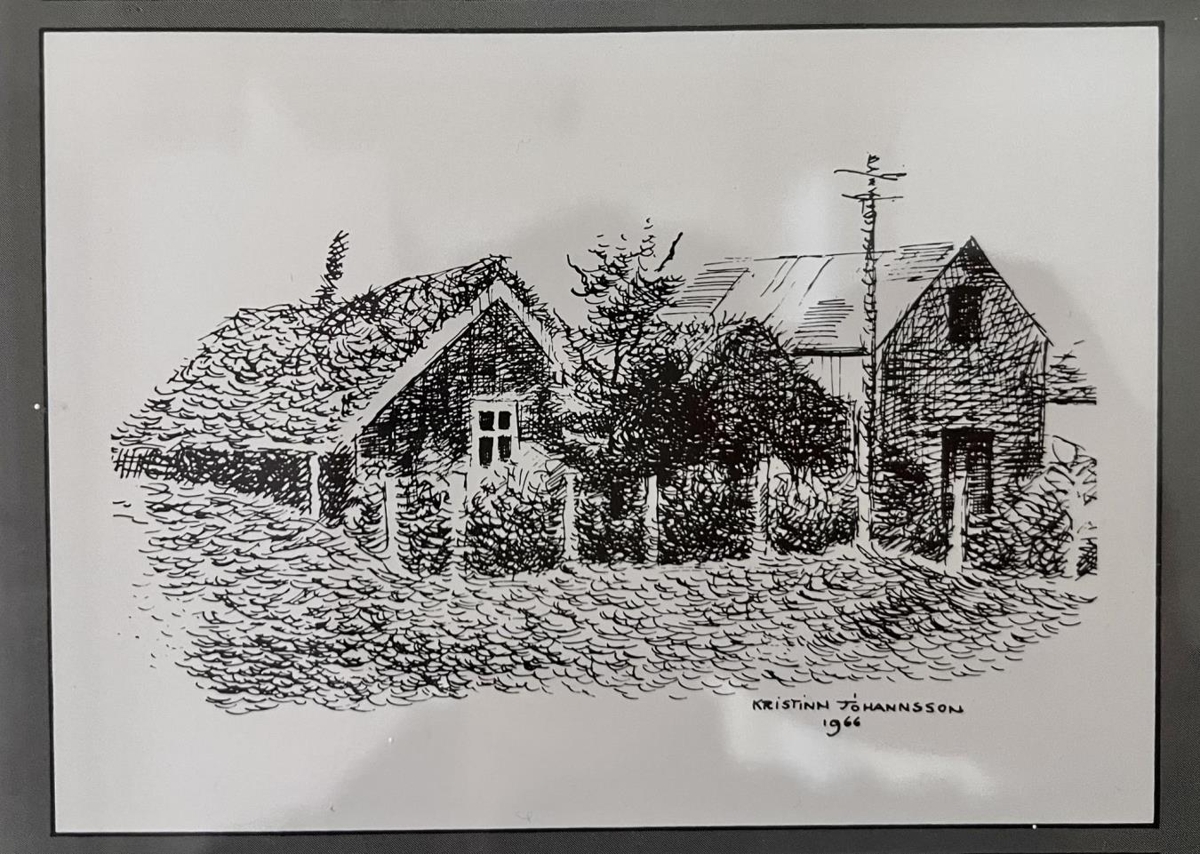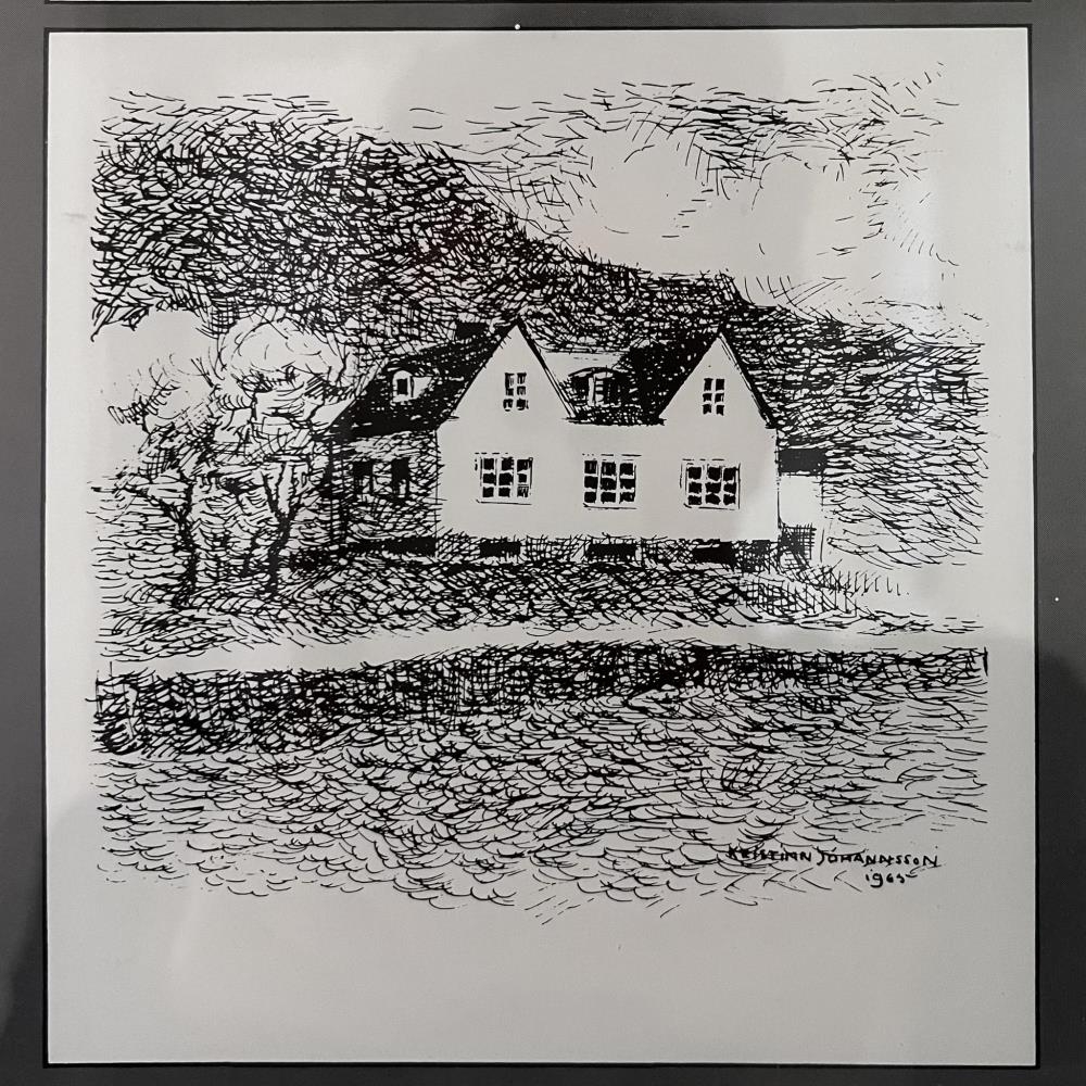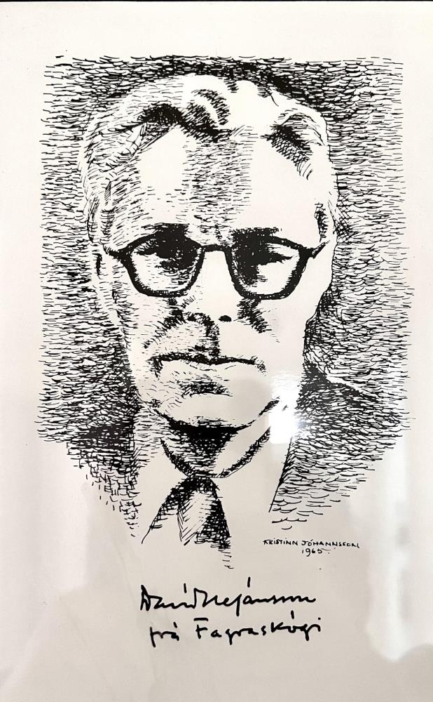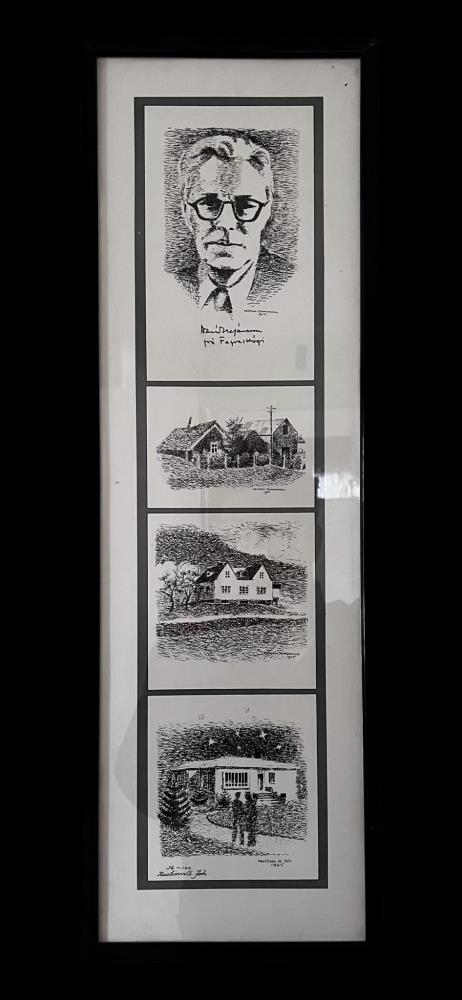 Teikningar eftir listamanninn Kristinn G. Jóhannesson. Tölusett eintak. Teikningarnar eru í aflöngum svörtum plastramma og eru 4 myndir. Efst er andlitsmynd af Davíð Stefánssyni, skáldi sem kenndi sig við Fagraskóg við Eyjafjörð. Svo koma teikningar af heimilum Davíðs, fyrst torfbær, síðar steinbyggingunni í Fagraskógi og loks Davíðshúsi, Bjarkarstíg 6 á Akureyri. Undirritað Kristinn G. Jóh 36/100.