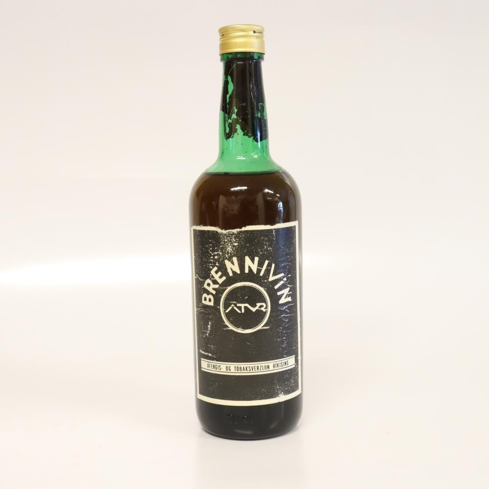 Krækiberjasaft á brennivínsflösku, framleitt árið 1982. Gefandi er Sigurgeir Torfason frá Miðhúsum í Garði.