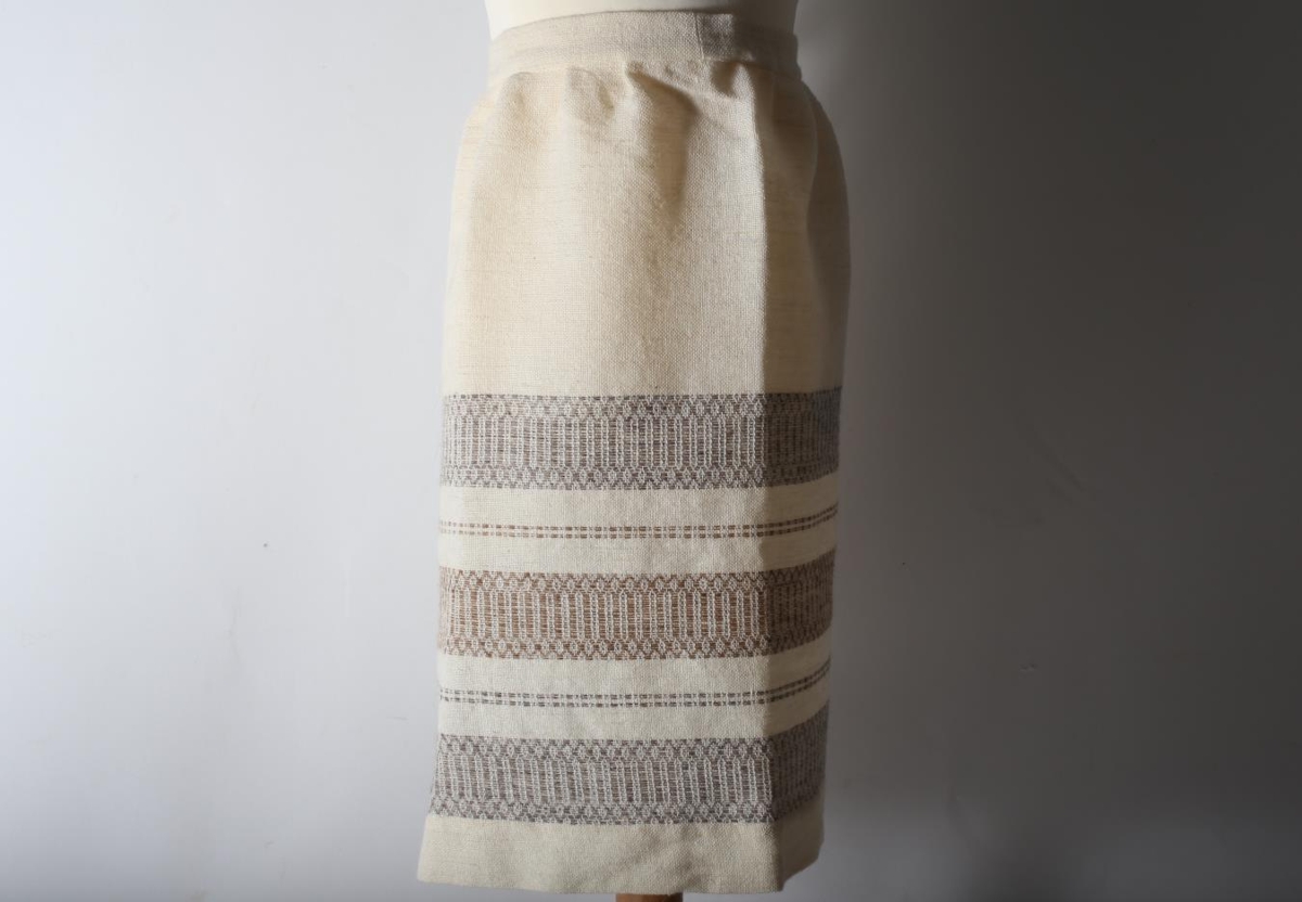 Ljós svunta úr ull með þrílitum munsturbekk að neðan. Úr fórum Jónu Jónsdóttur (1903-1983), Ekkjufellsseli í Fellum.