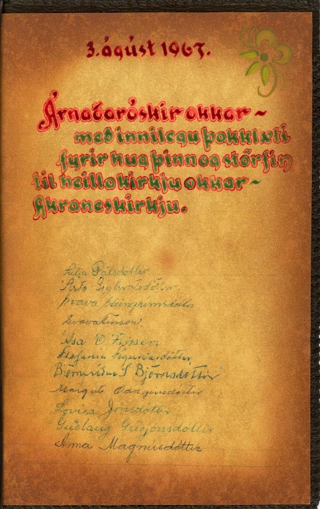 Texti á skjali: Frún Ingunn Sveinsdóttir - 3. ágúst 1963. Árnaðaróskir okkar með innilegu þakklæti fyrir hug þinn og störfin til heilla kirkju okkar - Akraneskirkju.