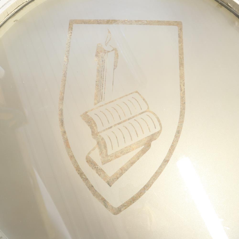 Gluggi úr Gerðaskóla í Garði með merki skólans á rúðunni. Þessi hringlótti gluggi var á stafni elsta hluta Gerðaskóla sem snéri að Garðbraut. Búið er að lagfæra þann hluta skólans all verulega, m.a. að skipta um þennan gamla glugga. Pálmi Steinar Guðmundsson smiður í Garði kom með gluggann á byggðasafnið til varðveislu. Annar samskonar gluggi er við gamla innganginn á elsta hluta Gerðaskóla.