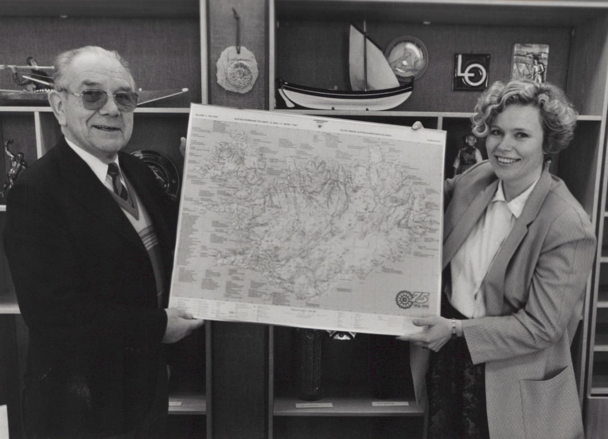 75 ára afmæli ASÍ í mars 1991. Lára V. Júlíusdóttir framkvæmdastjóri ASÍ afhendir Gústaf Ófeigssyni verðlaun í afmælisgetraun ASÍ sem efnt var til á 75 ára afmælinu. Vinnan í maí 1991, mynd: Róbert.