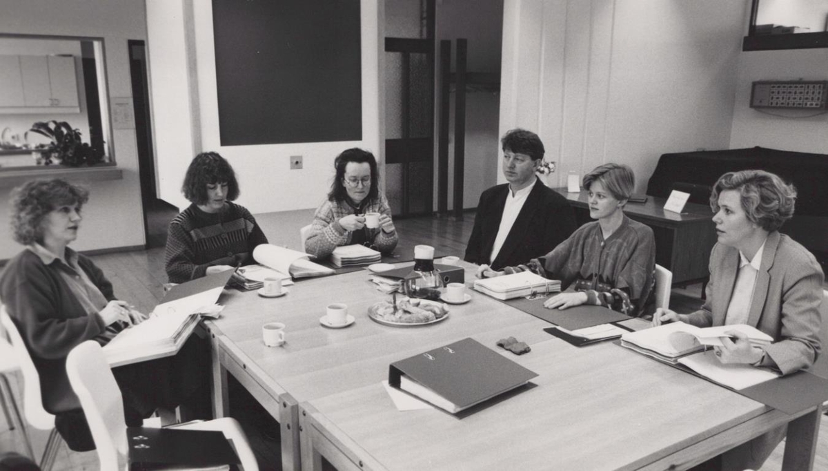 Dómnefnd í ljóðasamkeppni ASÍ og Iðunnar 1991, frá vinstri: Þórgunnur Skúladóttir, Kristín Mar, Olga Guðrún Árnadóttir, Ólafur Jónsson, Bergþóra Ingólfsdóttir, Lára V. Júlíusdóttir. Mynd: Vinnan/Róbert.