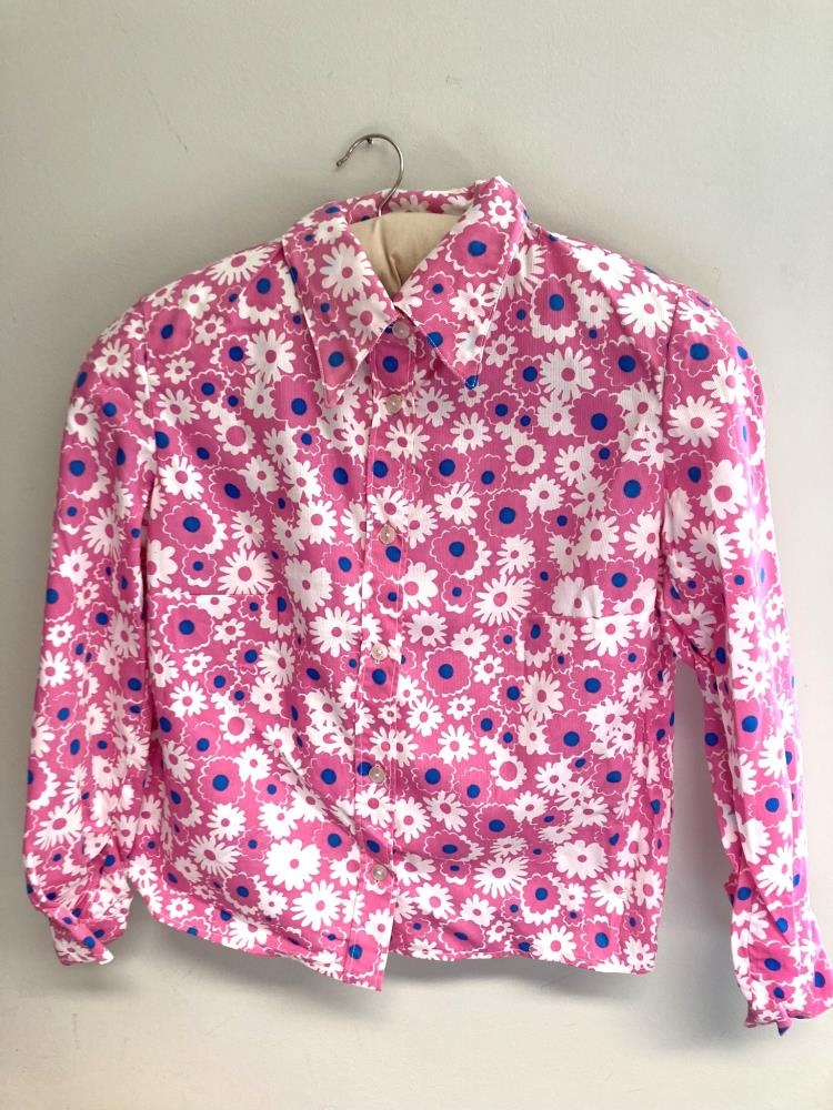 Blússa/skyrta, langerma með kraga. Hneppt að framan og á ermalíningum. Úr bleikmynstruðu efni. Úr eigu systranna Guðrúnar og Þorgerðar Bjarnadætra í Hól í Meðallandi.