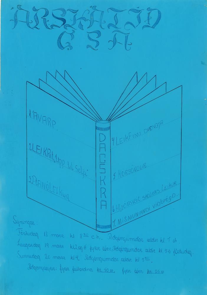 Fjögur handskrifuð auglýsingaplaköt sem nemendur Gagnfræðaskólans á Akranesi gerður í tilefni af árshátið nemenda dagana 18. mars, 19. mars og 20. mars 1966.
