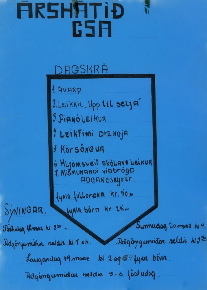 Fjögur handskrifuð auglýsingaplaköt sem nemendur Gagnfræðaskólans á Akranesi gerður í tilefni af árshátið nemenda dagana 18. mars, 19. mars og 20. mars 1966.