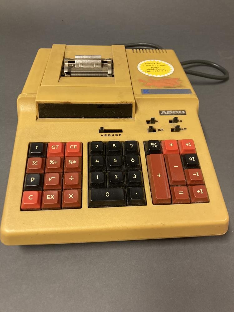 Rafmagnsreiknivél af gerðinni ADDO, model 9229. Raðnúmer 7060502. Framleidd í Japan. Kemur líklega af skrifstofu Nathan & Olsen í Reykjavík.
