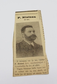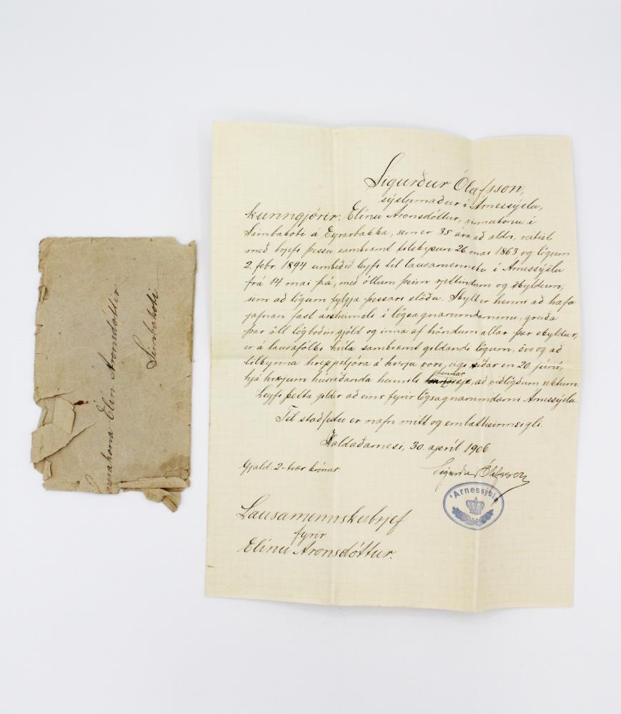 Lausamennskubréf Elínar Aronsdóttur í Simbakoti á Eyrarbakka. Skrifað af Sigurði Ólafssyni sýslumanni í Kaldaðarnesi í Sandvíkurhreppi þann 30. apríl 1906. Einnig blaðaúrklippa um Peter Nielsen. Elín var dóttir Arons Guðmundssonar bónda í Kakkarhjáleigu í Stokkseyrarhreppi, en hann og kona hans áttu 16 börn og tók Aron á móti þeim öllum. Systir Elínar var Guðlaug móðir Arons Guðbrandssonar (1905-1981) í Kauphöllinni sem fyrstur Íslendinga verslaði með verðbréf. Elín giftist ekki.
