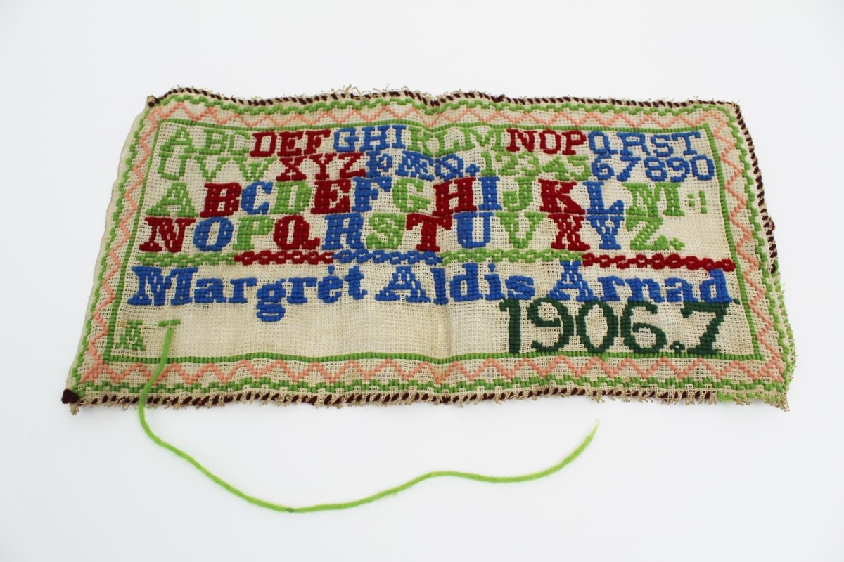 Strammi ísaumaður með ullargarni í ýmsum litum, þar á er stafrófið tvítekið. Nafnið Margrét Aldís Árnadóttir og ártalið 1906-1907. Margrét var dóttir Árna og Ingveldar í Stíghúsi á Eyrarbakka.