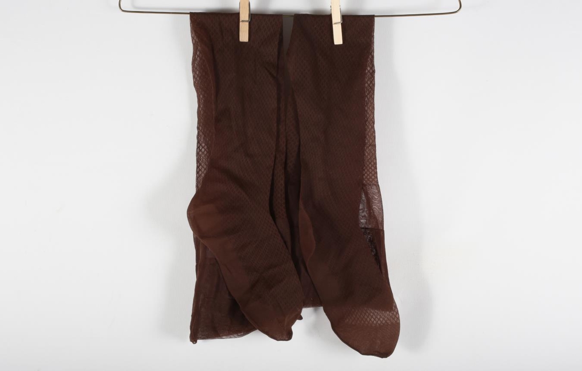 Brúnir nælonsokkar með netamunstri. Kemur úr búi Jónu Jónsdóttur (1903-1983) og Einars Sigbjörnssonar (1901-1995) frá Ekkjufellsseli í Fellum.