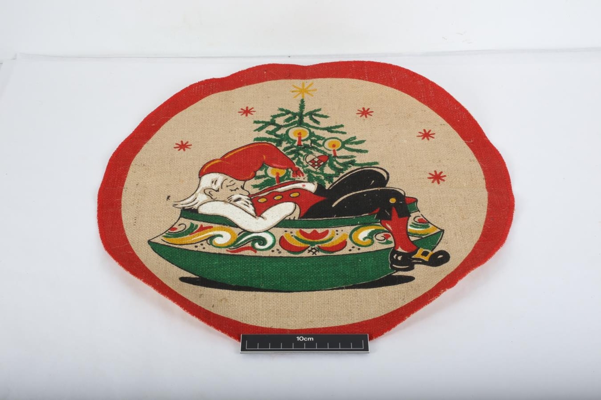 Kringlóttur jóla(trés)dúkur úr hör með rauðri líningu allan hringinn. Á dúknum er mynd af einhverskonar jólasveini sem sefur ofan í grænni skál og í bakgrunn er skreytt jólatré. Kemur úr búi Jónu Jónsdóttur (1903-1983) og Einars Sigbjörnssonar (1901-1995) frá Ekkjufellsseli í Fellum.