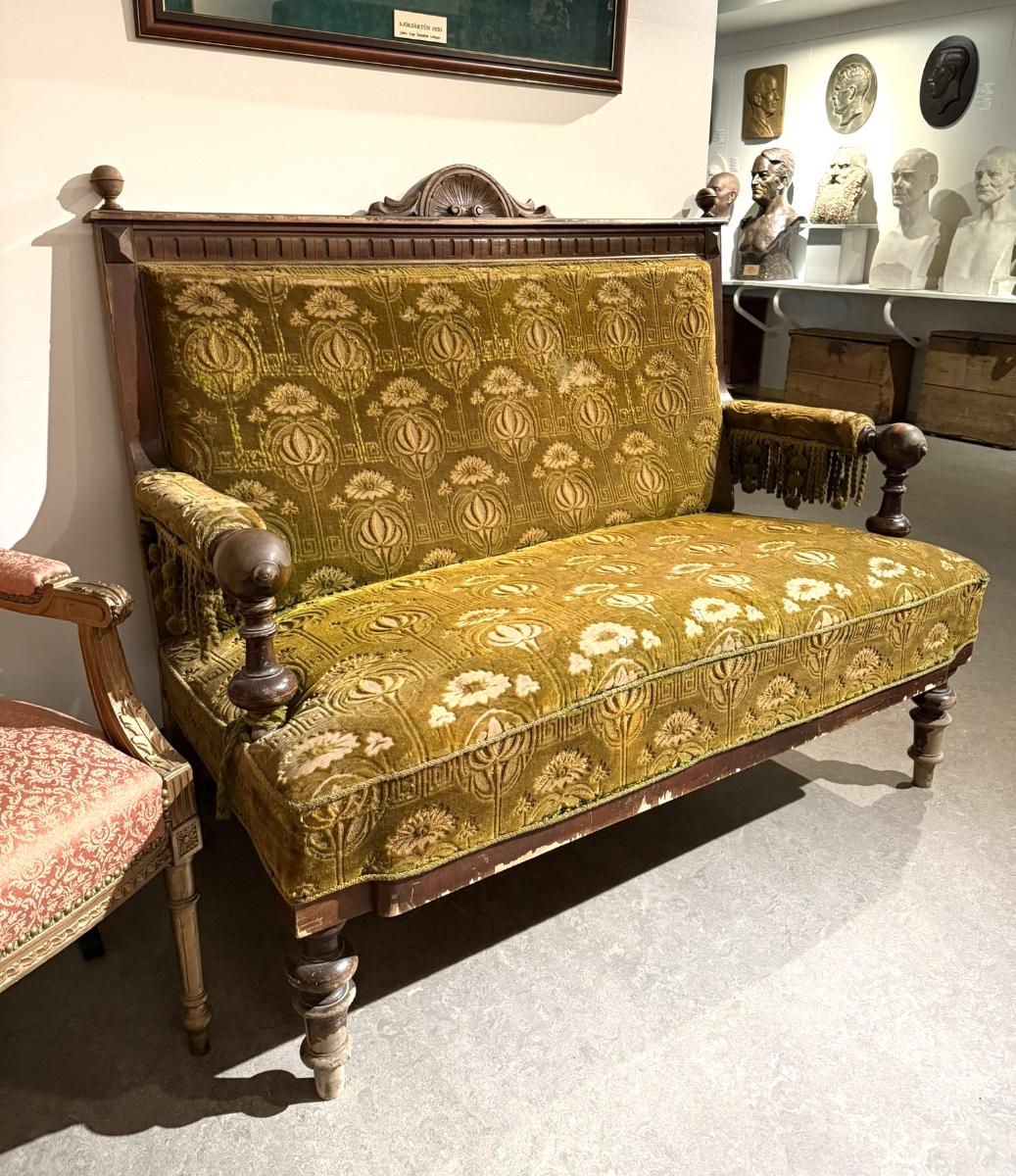 Sófi, klæddur brúnu, skreyttu flosáklæði. Gefið af Eggert og Huxley sonum Ólafs Ísleifssonar og Guðríðar Eiríksdóttur í Þjórsártúni: Húsgögn í stofu smíðuð fyrir konungskomuna 1907. Smiður Erlendur Eiríksson frá Minnivöllum, bróðir Guðríðar.
